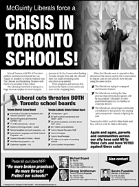 Description: Full page ad raising awareness about the need to reestablish adequate staffing levels in Toronto's public schools after years of devastating cutbacks under the Ontario's former Conservative government.
