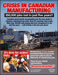 Description: Full page magazine ad warning of the precipitous decline of Canada's manufacturing sector due to government neglect (even before the global financial crisis hit). Part of the CAW's "Manufacturing Matters" campaign.