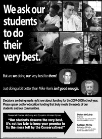 Description: Full page newspaper ad alerting the public to alleged manipulative tactics by Ontario's Liberal government surrounding the public education system.